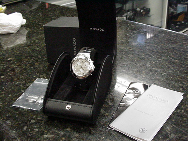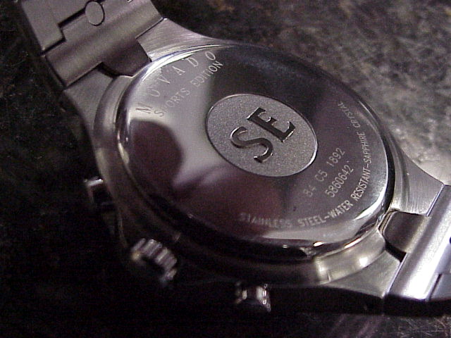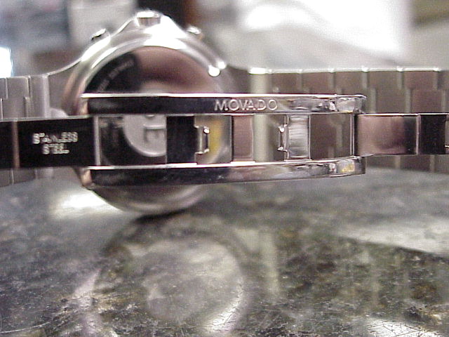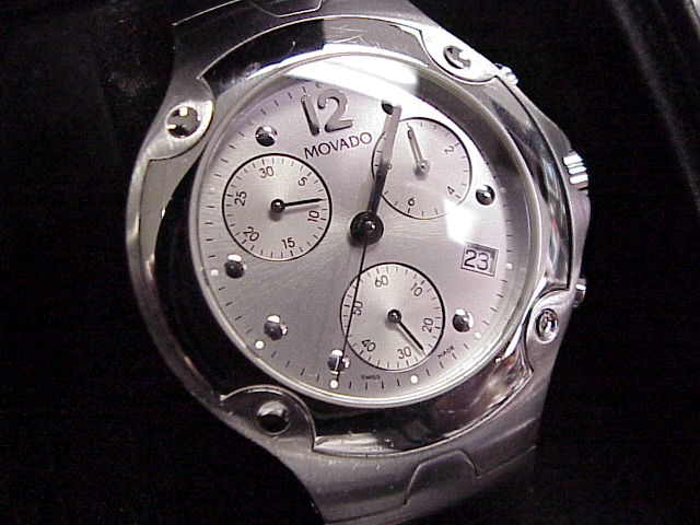 Dynamic, up-to-the-second time from Movado...introducing the Sport Edition men's chronograph. Highly stylized contoured design is bold and ultra-sleek in high performance stainless steel. Satin finished steel case is displayed on the brushed steel link bracelet.  Movado signature concave dot is presented on alternating bracelet links, along with the integrated brushed and polished steel bezel Silver colored dial with three sub-dials, silver tone and hour markers. 1/10th of a second, small seconds and 30-minute registers.  The watch is virtually new, with only a few very tiny scratches that can be buffed out on the underside of the band.  otherwise an absolute stunning watch.  See photos !!!